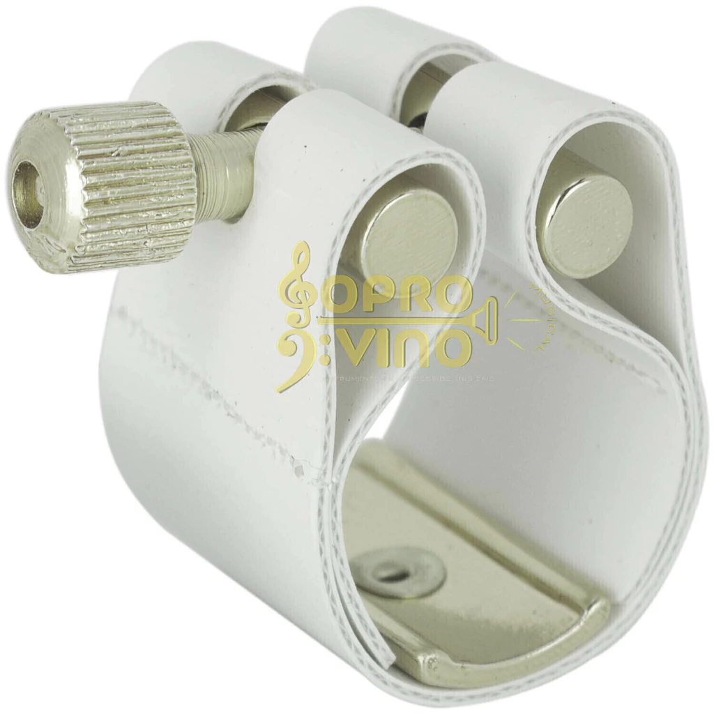 Kit braçadeira de couro ( sintético ) na cor Branco com ressonador e tampa em plástico injetável na cor branco. Braçadeira desenvolvida a partir de diversos testes de sonoridade realizados por músicos profissionais, no qual chegaram a conclusão de que a braçadeira com o ressonador de metal proporcionava sonoridade com mais brilho e encorpada, ou seja, som mais cheio e volumoso, porém com mais brilho (não estridente), ideal para músicos que preferem sonoridade com mais brilho, mas sem ser estridente ou agressiva/irritante.