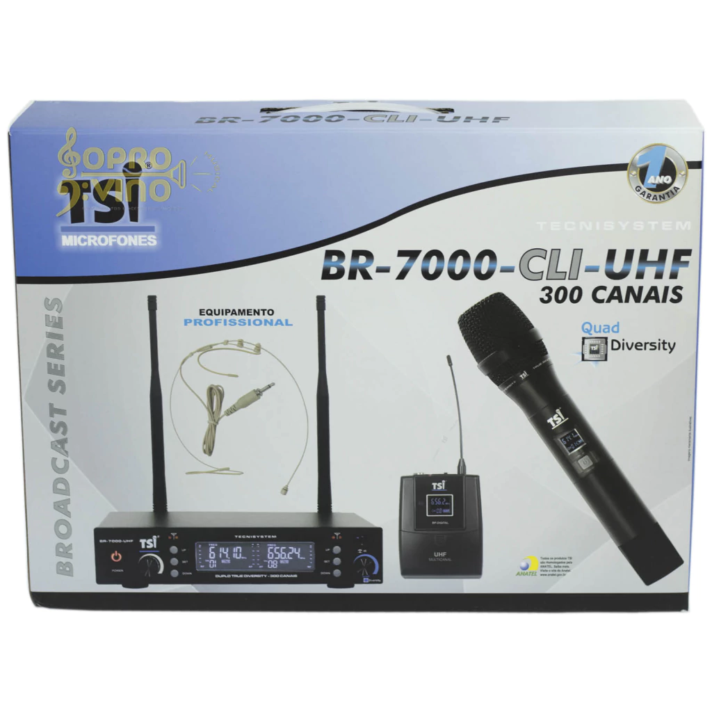 O microfone TSI BR 7000 CLI UHF é um sistema duplo de microfone sem fio com processo de recepção Duo 4 Diversity (2x True Diversity), ou seja, é um sistema que possui 4 receptores que recebem todos os sinais e eletronicamente os separam e seleciona os sinais de qualidade superior, não somente o sinal mais forte como ocorre no sistema de antena diversity, sendo assim o sistema Duo 4 Diversity processa o melhor sinal recebido e na fase correta, desta forma possui uma recepção continua sem Delay (atrasos) e sem espúrios, resultando em um sistema confiável a nível alto de transmissão (Broadcast).