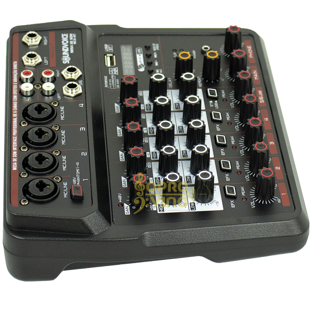 O mixer conta com controle de ganho, ajustando facilmente o nível do volume. O Phantom Power de 48V é adequado para fornecer a alimentação direta e correta ao microfone do condensador. A porta de saída do fone de ouvido tem alta definição, MP3 Player, e função Interface, podendo se conectar diretamente ao computador.