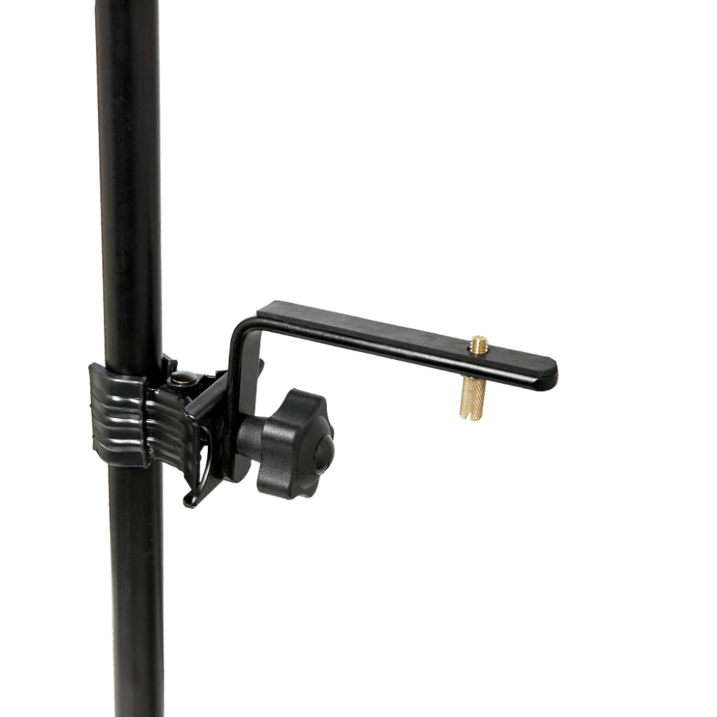 Suporte universal com Clamp, ideal para segurar câmera e demais acessórios compatíveis com a rosca do parafuso. O Clamp (abraçadeira) possui sistema de rosca e mola com giro de 360º, ajustes bem leve e fácil, rápido de abrir e fechar, adaptável a qualquer tubo de 18mm a 45mm de diâmetro, podendo ser fixado a qualquer pedestal, seja ele de prato, microfone ou estante de partitura. O Suporte possui um lindo acabamento na cor Preto Fosco.