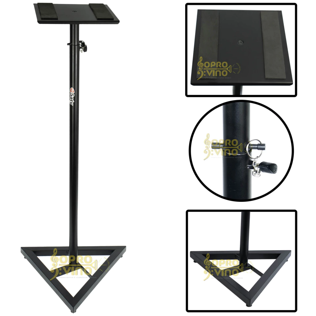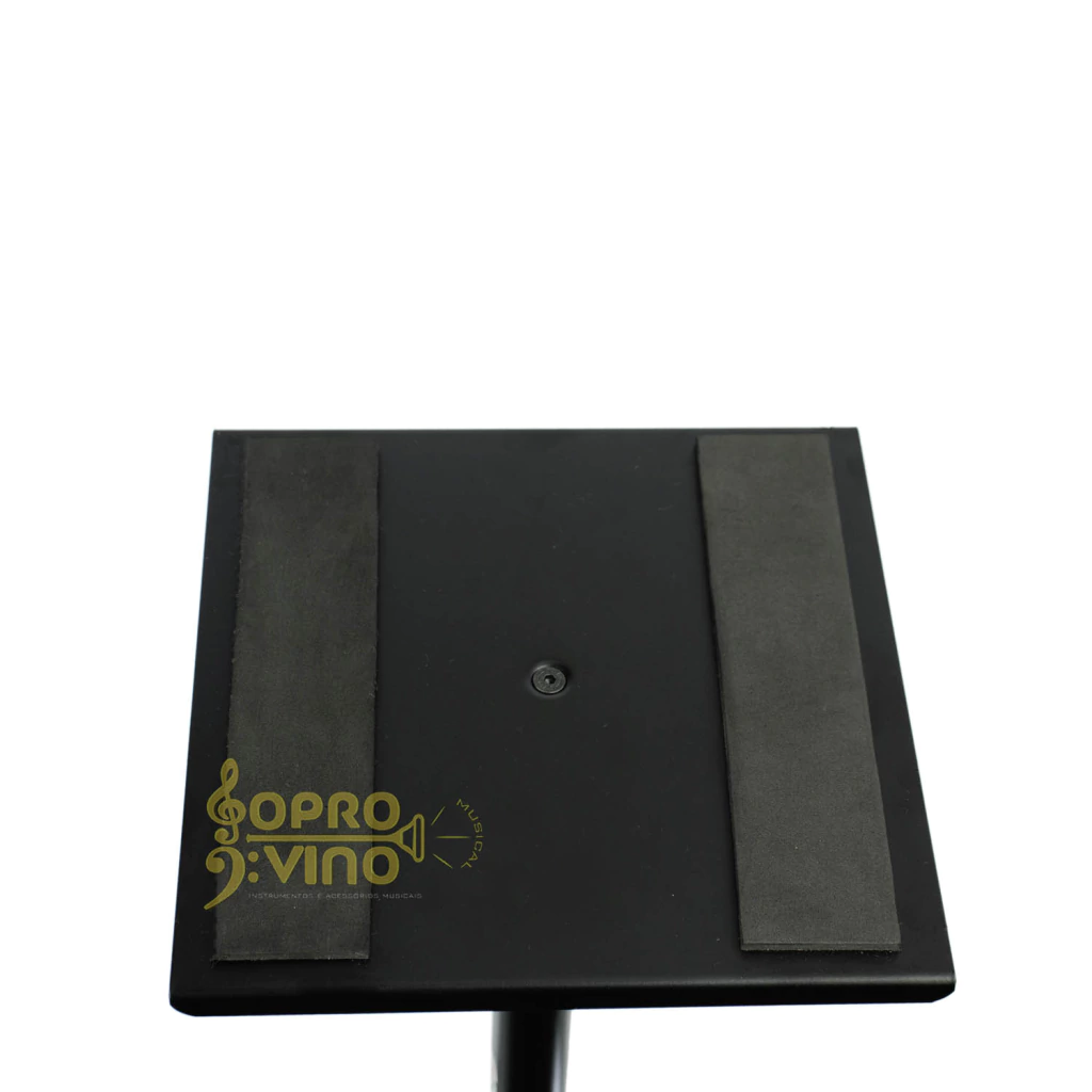 Esse modelo de suporte é bem utilizado em estúdios musicais, eventos (palestras, igrejas e/outras apresentações). Possui a base (placa) fabricada em aço com revestimento em pintura Epóxi (acabamento fino e profissional), a base de apoio é revestida com 2 faixas/tiras em borracha macia (E.V.A), deste modo evitando que o item ao qual encontra-se sobre a superfície (placa de aço) deslize e/ou ao mesmo tempo evitando a redução de vibrações indesejadas.