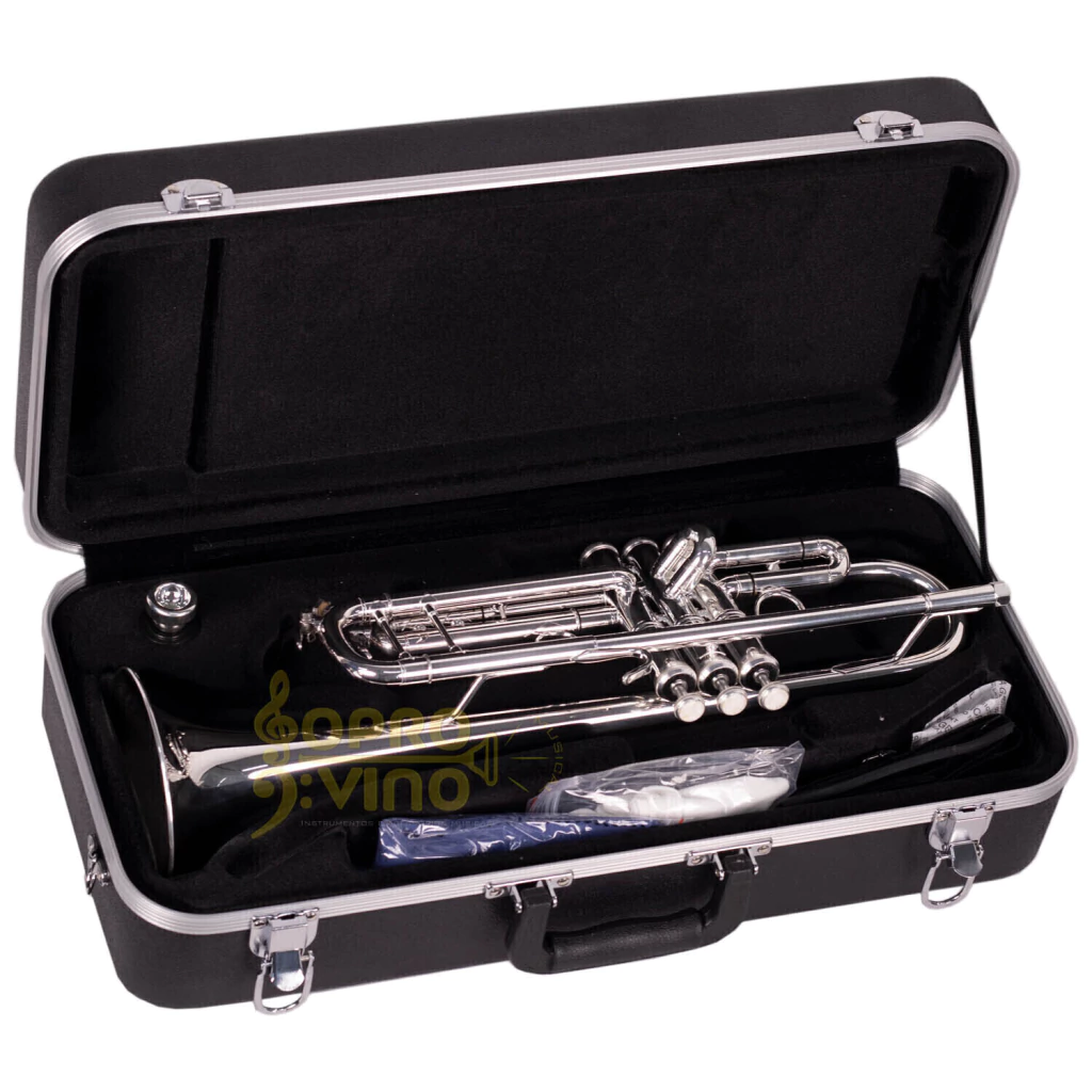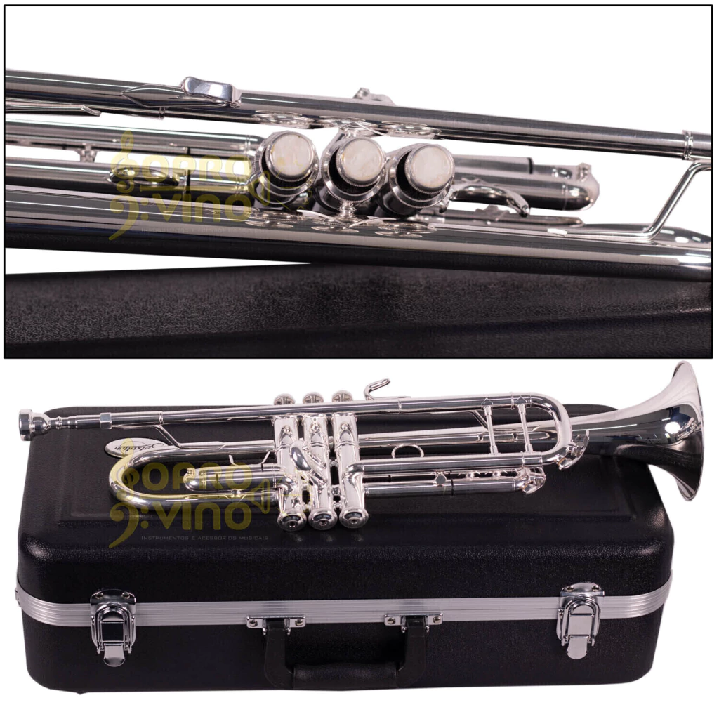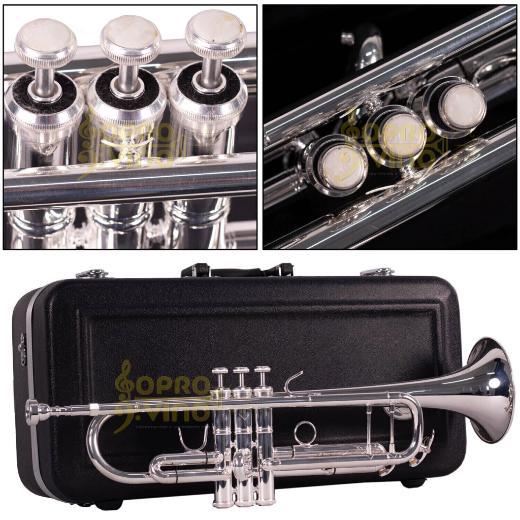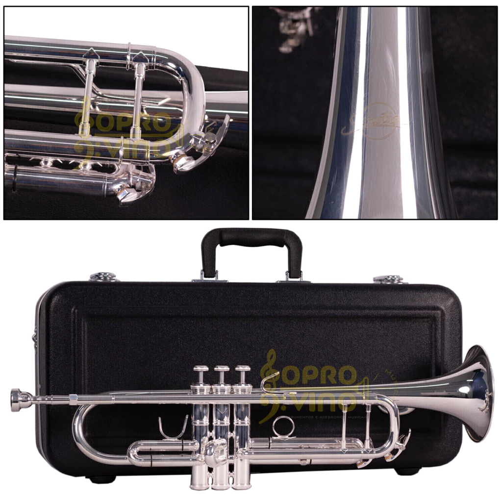 O Trompete Sebastian® modelo STR-TR8331S é um instrumento de sopro com construção, acabamento e sonoridade diferenciada. Instrumento fabricado com materiais de alta qualidade com metal Latão puro, não reciclado, com acabamento do corpo, capelotes, pompas e botões em Prata 1000 de alta pureza.